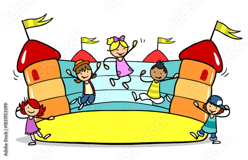 Gruppe Cartoon Kinder feiert auf Hüpfburg Kindergeburtstag
