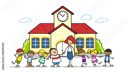 Cartoon Frau mit Gruppe Kinder bei Kita Ausflug