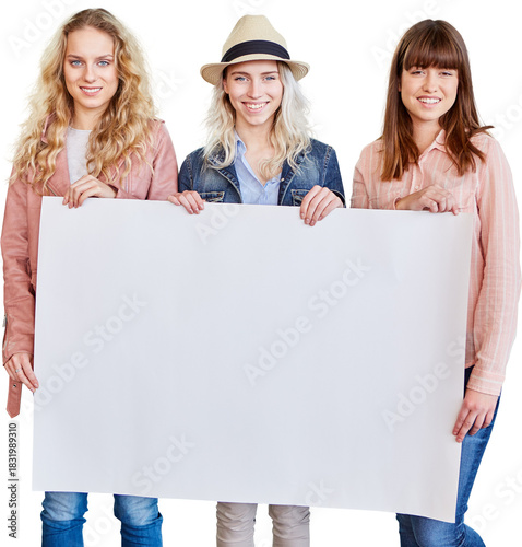 Drei junge Frauen halten leeres weißes Schild