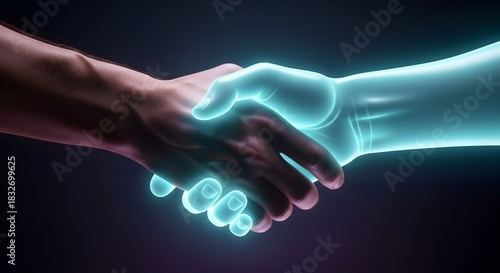 Handshake between human and futuristic glowing artificial intelligence hand, representing digital partnership and technology integration on a dark background. #1832699625