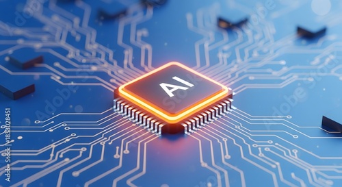 Illuminated central processing unit (CPU) chip labeled AI integrated into a glowing digital circuit board representing machine learning and deep computing. #1833028451