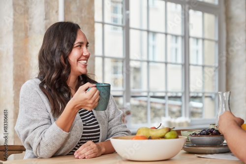 Frau lacht beim Kaffee trinken in Küche