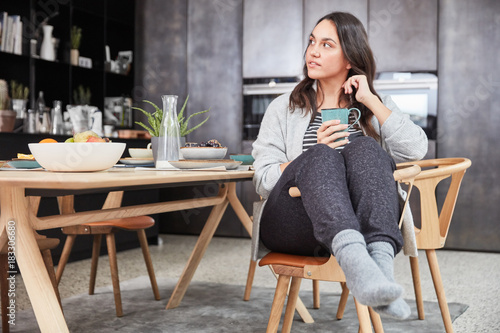Frau sitzt gemütlich in Küche beim Frühstück
