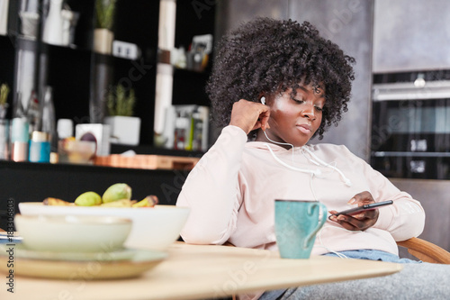 Lachende afrikanische Frau hat Spaß mit Smartphone