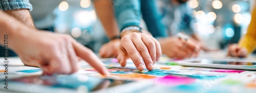 Teamwork Brainstorming Session Hands Pointing at Colorful Designs on Table with Tablets for Creative Collaboration and Planning