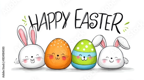 Happy Easter Illustration With Cute Bunnies And Decorated Eggs On White Background For Holiday Greetings And Spring Celebrations