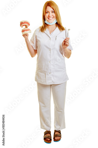 Frau als Zahnärztin mit Gebiss zur Prophylaxe