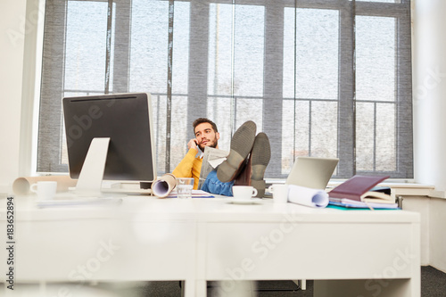Geschäftsmann telefoniert entspannt im Büro