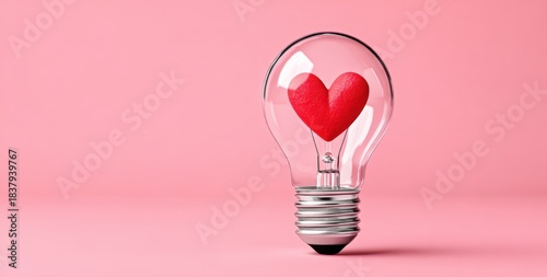Heart-shaped glowing light bulb on red background representing love and warmth