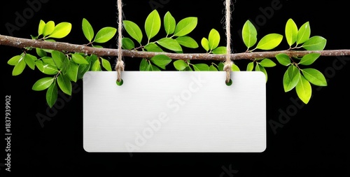 White wooden sign hanging from a branch with green leaves on a black background decor
