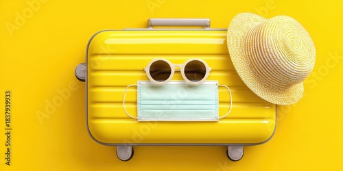 Yellow Suitcase With Hat Sunglasses and Mask on Yellow Background for Travel and Vacation During Pandemic Times