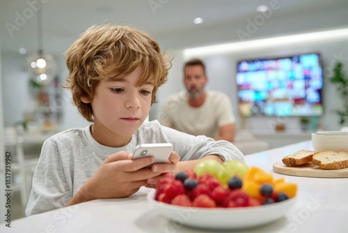 Young boy at the kitchen table using a smartphone with a fruit bowl and bread nearby