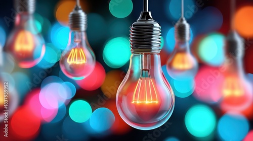 Colorful light bulbs glow in an abstract background with bright bokeh lights