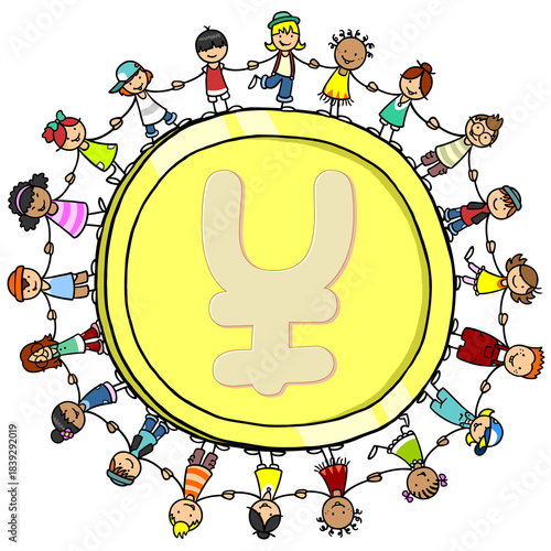 Kinder im Kreis halten Hände im japanische Yen Münze