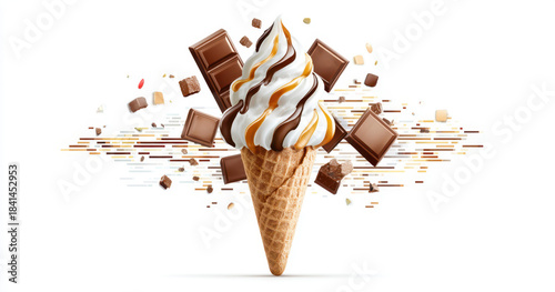 Sweet ice cream cone with vanilla and chocolate swirls, chocolate chunks flying around