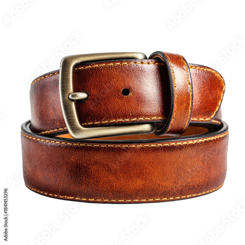 PNG Brown leather belt with brass buckle, isolated on white background, high quality and versatile accessory