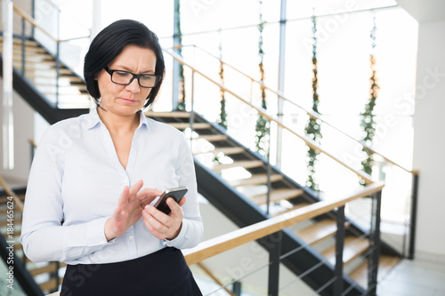 Business Frau tippt eine SMS auf ihrem Smartphone