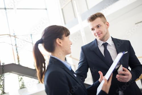 Junge Geschäftsfrau bespricht sich mit einem Kollegen