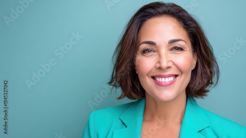Confident Brazilian businesswoman in stylish blue suit against mint background