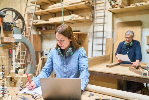 Experienced craftsman teaching young apprentice in a woodworking shop