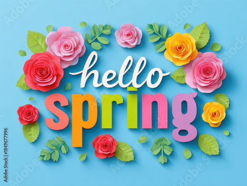 Hello Spring Floral Design With Colorful Paper Cut Letters Roses And Green Leaves On Light Blue Background For Seasonal Greetings