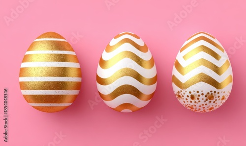 Three Easter Eggs With Gold And White Stripes On Pink Background For Holiday Decorations And Festive Celebrations Springtime Themes #1854048346