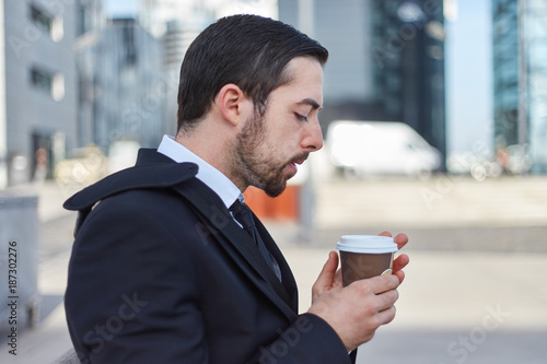 Nachdenklicher Geschäftsmann trinkt Kaffee