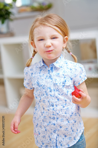 Blondes Kind isst eine rote Erdbeere