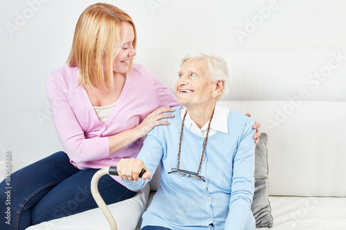Alte Seniorin im Rollstuhl mit Frau vom Pflegedienst