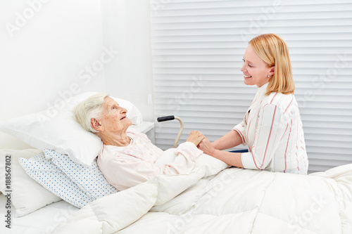 Frau macht Krankenbesuch bei bettlägeriger Seniorin