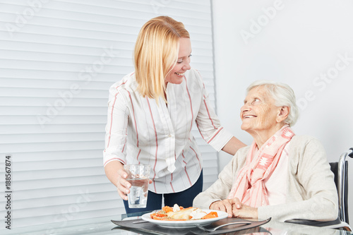 Krankenschwester mit einer alten Frau im Rollstuhl
