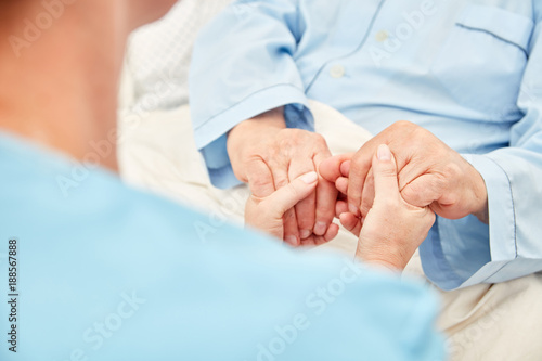 Fürsorgliche Pflegekraft hält die Hände eines kranken Senioren als Sterbebegleitung