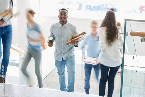 Gruppe Studenten steht im Uni Treppenhaus