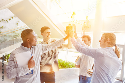 Gruppe Studenten macht High Five in Universität