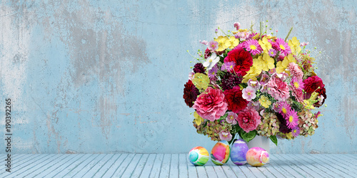 Bunter Blumenstrauß und Ostereier zu Ostern