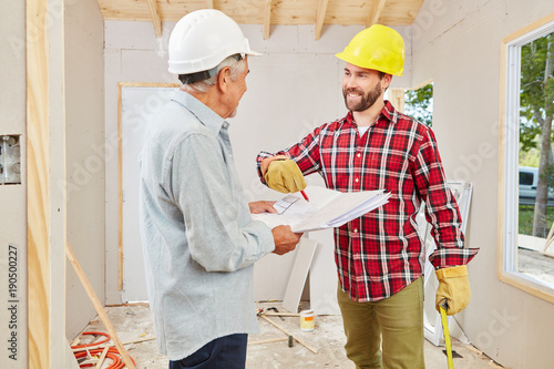 Handwerker mit Bauplan besprechen Umbau