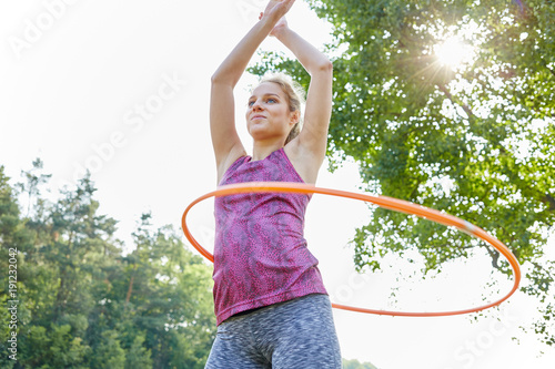 Frau dreht Reifen um den Körper