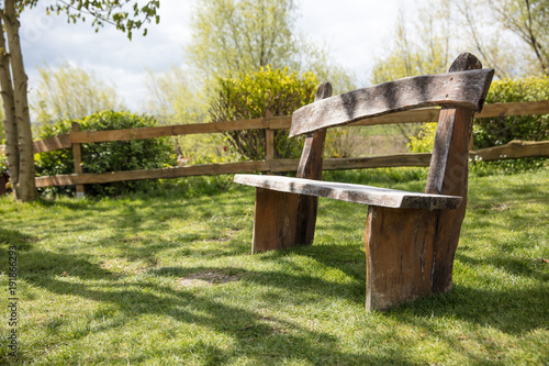 Tranquil morning by a serene pond with a weathered bench amidst misty scenery