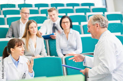 Professor stellt Fragen an junge Ärztin oder Studentin