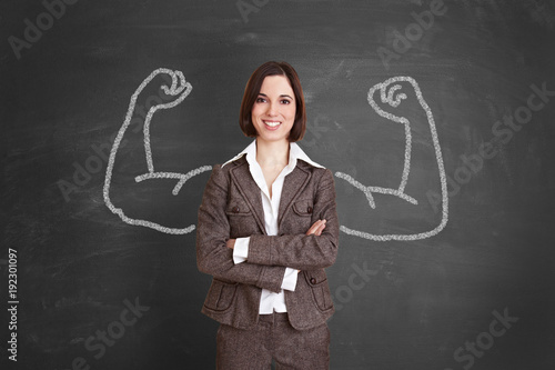 Erfolgreiche Frau mit aufgemalten Muskeln