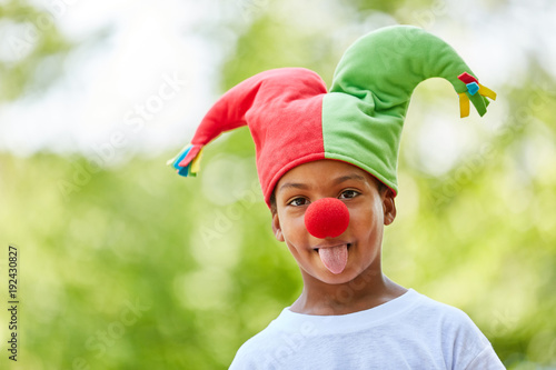 Junge mit Narrenkappe hat Spaß und zeigt Zunge