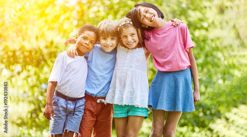 Multikulturelle Gruppe Kinder umarmt sich im Sommer