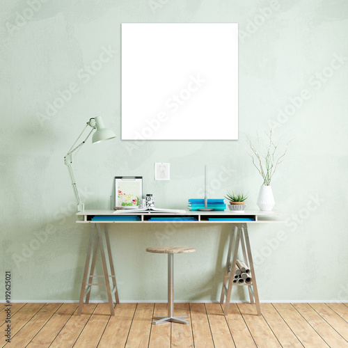 Schreibtisch mit Platz für Leinwanddruck an Wand