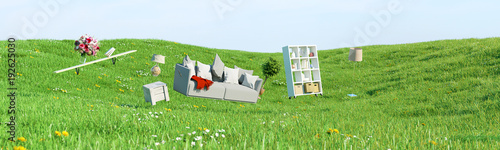 Schwebende Möbel in Wohnzimmer als Panorama