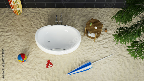 Badewanne im Bad mit Sandstrand als Wellness Konzept