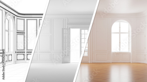 Leerer weißer Raum in Altbauwohnung mit Balkon