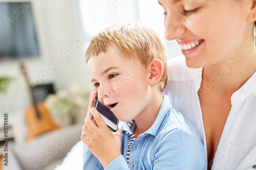 Junge telefoniert unter Aufsicht vom Babysitter