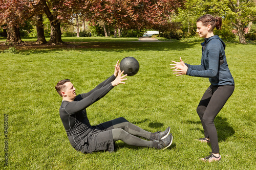 Mann trainiert mit Fitnessball bei Personal Trainer
