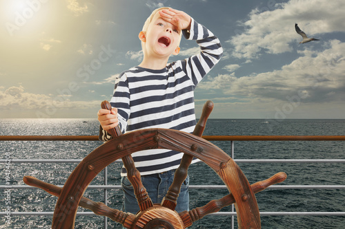 Kind als Seemann mit Schatzkarte und Fernrohr