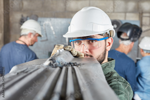 Arbeiter kontrolliert ein Bauteil aus Stahl